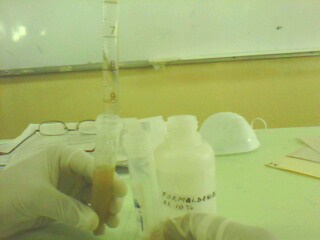 a) al último sedimento se le agregan 10 ml de solución de formaldehido al 10%, después lo mesclamos y dejamos reposar durante 10 minutos.